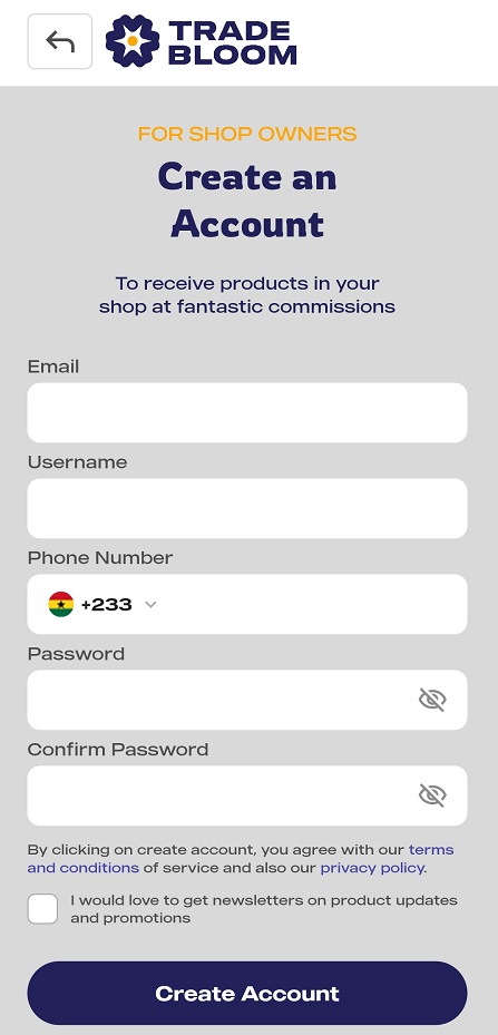 Congratulations! You have completed your profile. It’s time to enjoy the full benefits of joining Trade Bloom on the BloomUp. You have one more step to complete and you will be able to shop for products from Ghana. Click on Add Shop to continue.